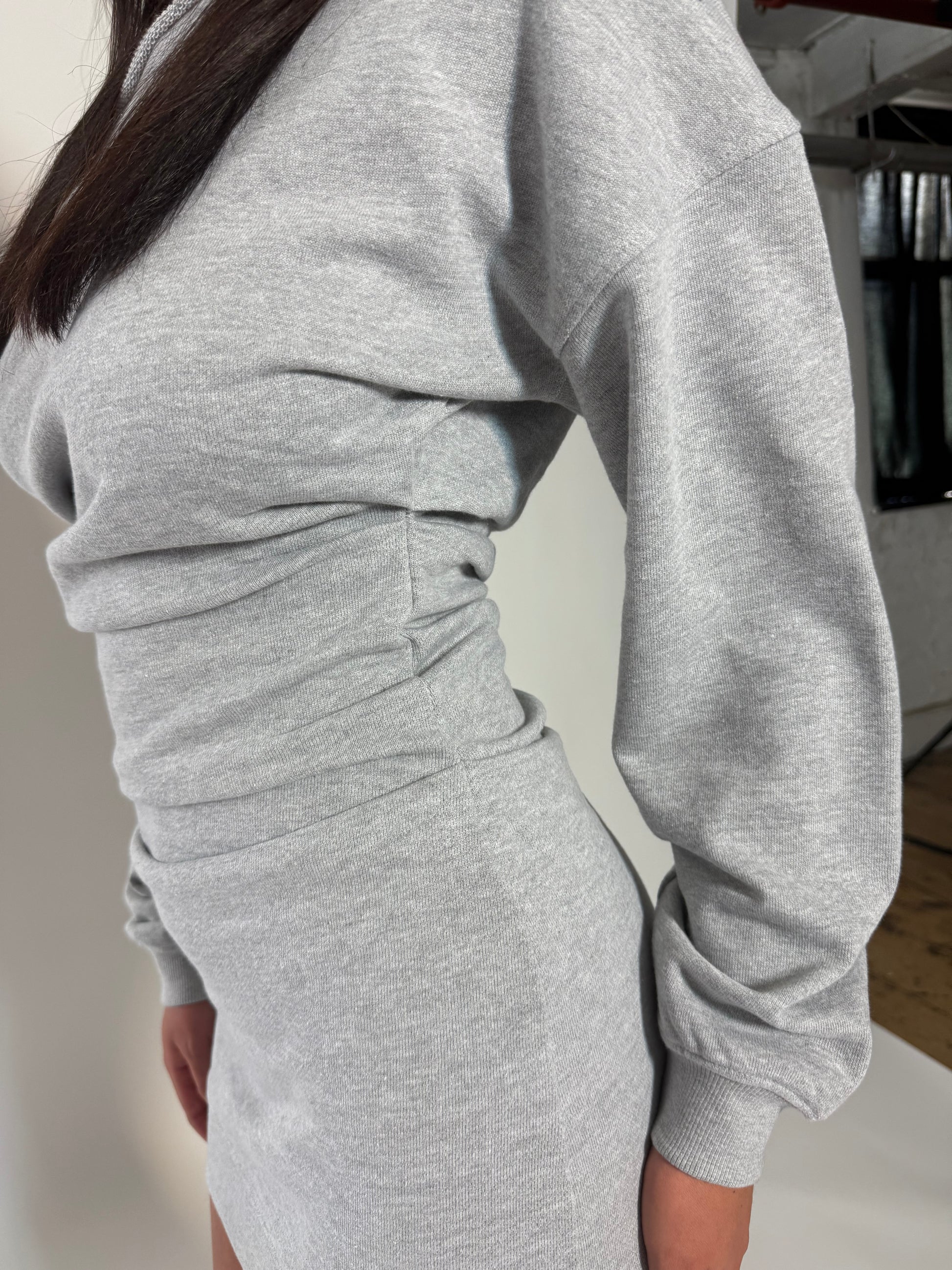 Made from a soft 260gsm jersey with a loop back interior to prevent bobbling, this grey marl off shoulder dress combines comfort with structure. The oversized upper body contrasts with a fitted, ruched waist for a flattering silhouette. Can be styled as both a dress and a top, making it perfect for all your occasions.